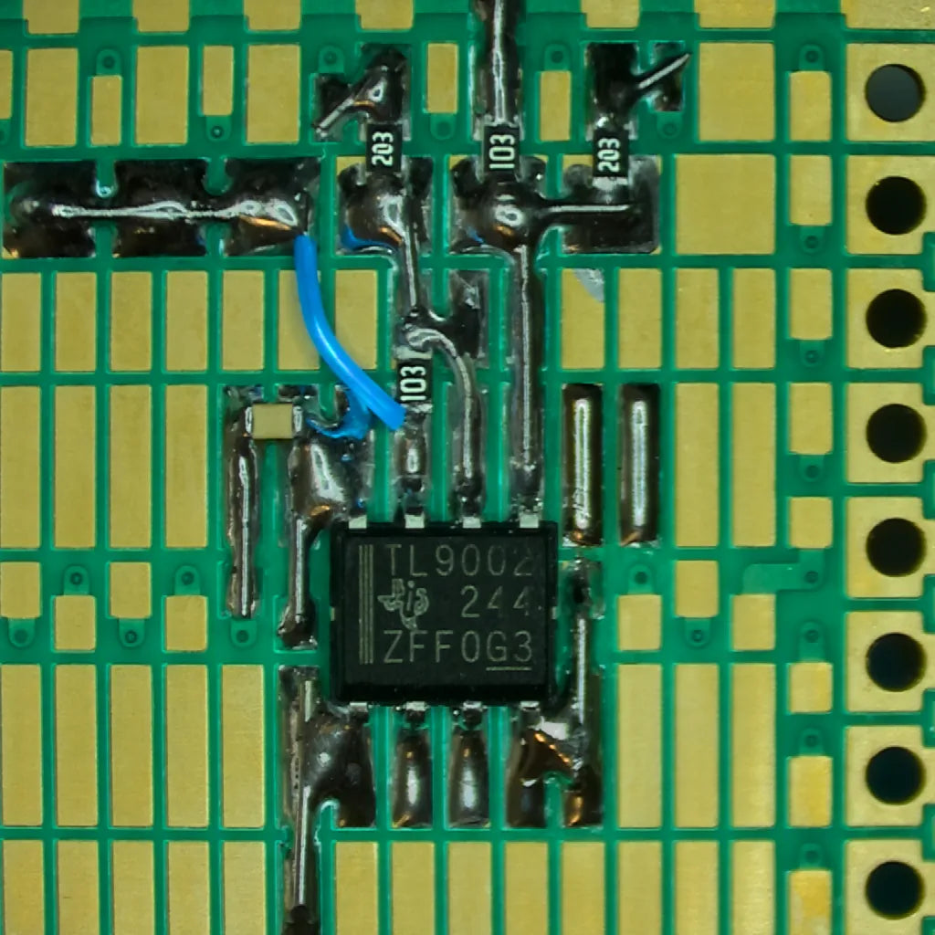 It is not always possible to build a given circuit in a single layer with just bare wire and solder bridges. If there is not enough board space or connection resources then we must resort to soldering in tiny insulated jumper wires, like the blue Kynar (PVDF) wire above. This is the same circuit as in the first example, but we have compressed the layout into a smaller horizontal space, at the cost of requiring the output signal to be wired out.